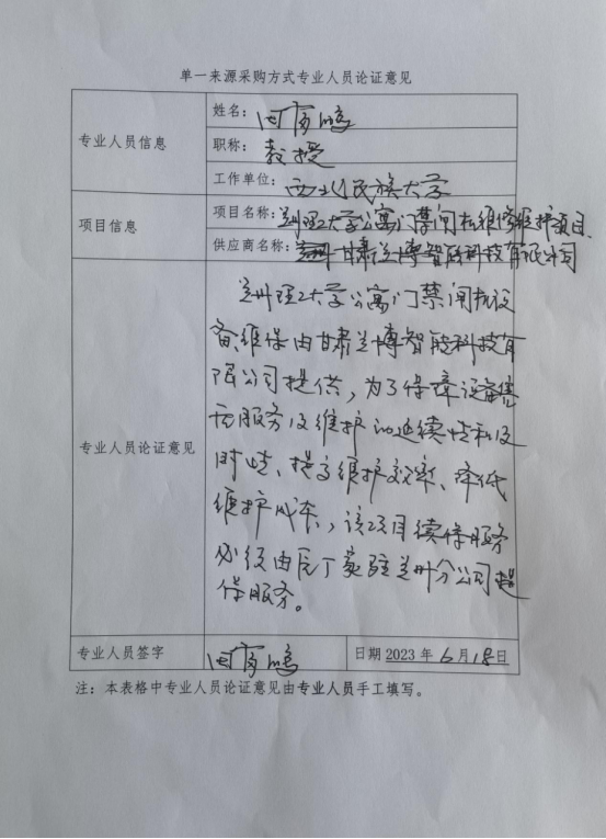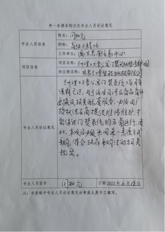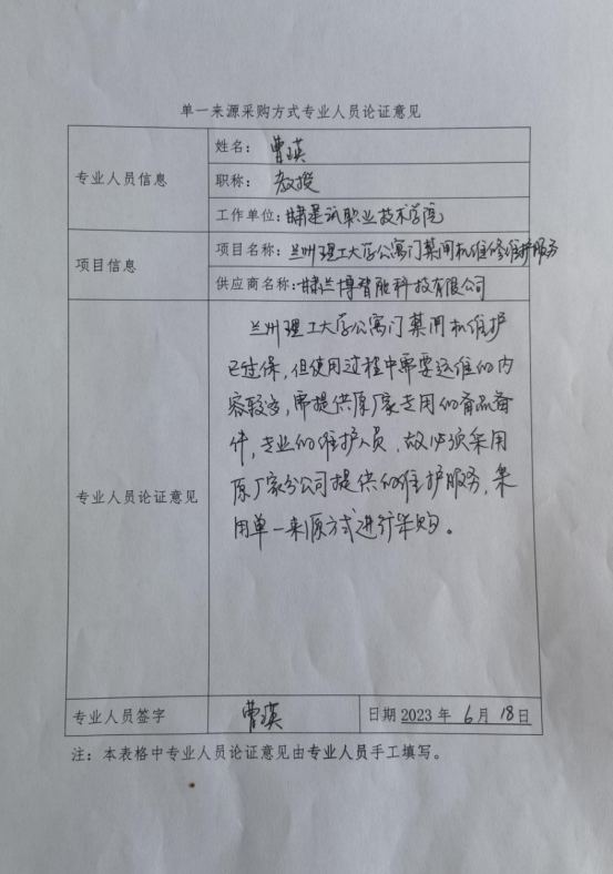 采用单一来源采购方式的原因及说明:兰州理工大学公寓门禁闸机维修维护项目,需要供应商提供原设备厂家设备专用的零配件和专业的技术维护人员,甘肃兰博智能科技有限公司是原设备厂家在甘肃唯一的分公司,原项目所用的产品和售后维护就是该公司提供的;据了解该公司在兰州具有现成的备品备件库和相关技术人员,之前提供的维护也及时到位,为保障维护服务的延续性和时效性,根据《中华人民共和国政府采购法》第三十一条规定,拟采用单一来源方式采购。