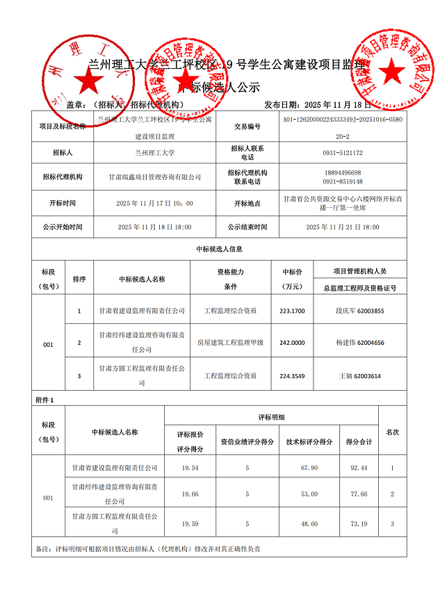 兰州理工大学兰工坪校区19号学生公寓建设项目监理中标候选人公示